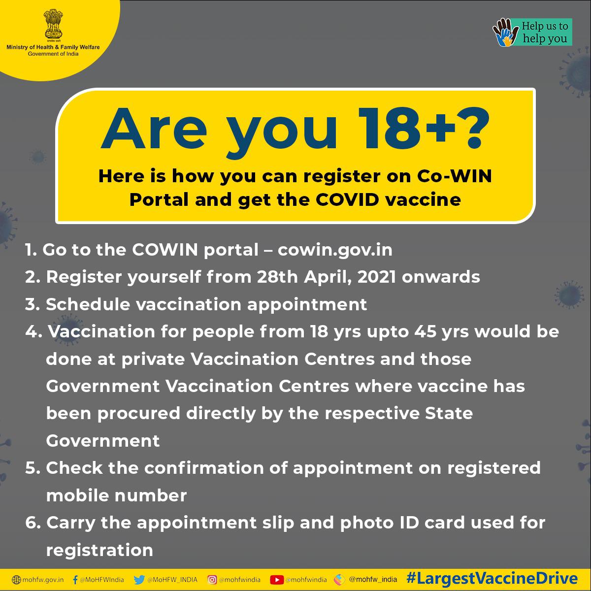 Those who are 18 years of age or older can register for covid vaccination. For 18 years and above covid vaccination starts from 1 may 2021. Here's what you need to know ahead of the registrations. The cowin portal — app where citizens can register for vaccination against coronavirus — will be made ready for 18 plus beneficiaries by april 24. Vaccination for people above 18 will begin on may 1. Under the third phase, beginning on may 1, everyone above the age of 18 years will be eligible to get. Registrations for 18 plus citizens to book. • when it is your turn, you will receive an sms with the date, time and. How to register via cowin portal, aarogya setu app. In phase 3 of the world's #largestvaccinedrive starting from 1st may 2021, all citizens above 18 years will be eligible for the vaccination. India is all set to begin the registration of the phase 3 vaccination drive from saturday, may 1. Tell the citizens of chhattisgarh who register for vaccination that you will be given two doses of the vaccine in a few days. You will receive alerts and information digitally rather than through the post.